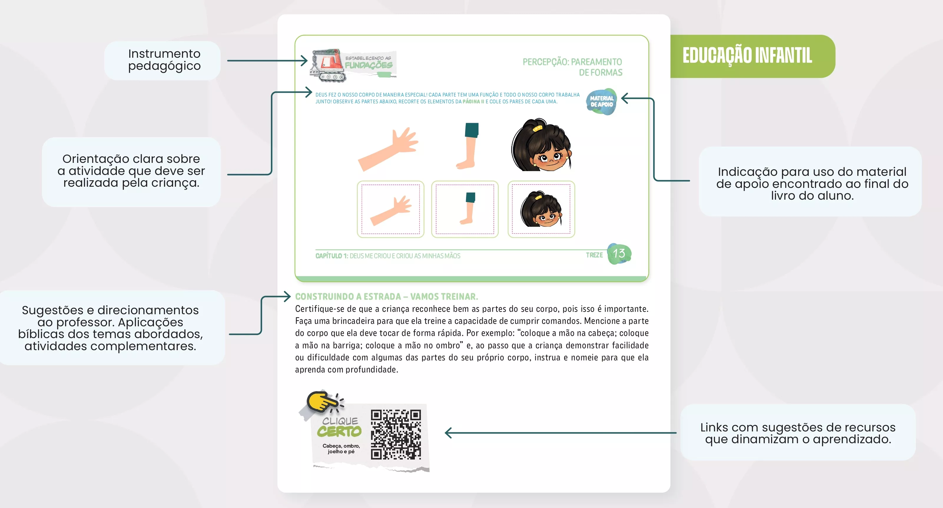 Uma coleção desenvolvida para ensinar, com base nos princípios bíblicos, conteúdosessenciais de linguagem, matemática, natureza e sociedade na Educação Infantil.Utiliza o método fônico na alfabetização, valoriza a ordem, a lógica matemática comoexpressão do caráter de Deus e aborda o mundo como criação de Deus.